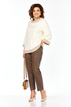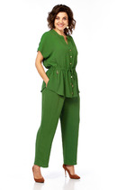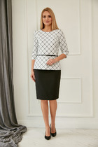 Блузка прямого силуэта с центральной застёжкой. Вырез горловины оформлен отложным воротником со стойкой. Спинка с кокеткой и встречной складкой. Рукав длинный с манжетой по низу. Застежка манжеты на 2-е петли и пуговицы. Юбка А-образного силуэта с накладной частью по переду в виде запаха с застежкой на полукольца. По переду планка декорированная кнопками. По левому боковому накладной карман. Застежка потайная молния в среднем шве заднего полотнища. Для максимально комфортной посадки по бокам пояса вставлена эластичная резинка.