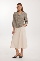 Образ излучает элегантность и утончённость, сочетая мягкую классику с лёгким акцентом на современность. Кремовый жакет подчёркивает свет лица и создаёт впечатление мягкого сияния, а тонкий контрастный кант формирует графичность и стройнит силуэт. Мягко приталенный крой и декоративные пуговицы придают наряду изысканный. Костюм полуприлегающего силуэта с фигурными рельефами от плеча проходят по переду, а контрастный тёмный кант по рельефам, борту, карманам и низу визуально стройнят. Рукав втачной двушовный с манжетой пот низу. Манжета декорирована пуговицами и кантом.   Юбка с центральными складками и  разрезом  добавляет женственность.