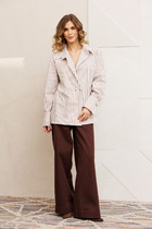 Изысканный костюм, воплощающий элегантность и уверенность. Мягкий сатиновый блеск ткани придаёт образу утончённый вечерний шарм, а глубокий сливочно-шоколадный оттенок создаёт впечатление благородного спокойствия и сдержанной роскоши.