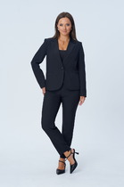 Лаконичный крой, модные цвета и идеальная  посадка делают этот комплект-тройку актуальным во все времена! Жакет полуприлегающего силуэта с центральной застежкой на одну пробивную петлю и пуговицу. Перед с рельефными швами, с горизонтальными карманами с клапаном и двумя обтачками. Спинка со средним швом и рельефными швами, выходящими от линии проймы. Рукава втачные, двухшовные, низ декорирован пришивной пуговицей. Воротник – втачная стойка. Жакет на подкладке и с плечевыми накладками. Блуза полуприлегающего силуэта с фигурной линией низа. Перед с нагрудными вытачками. Застежка по центру горловины спинки на навесную петлю и пуговицу. Рукава – крылышко со сборкой по окату. Юбка зауженная к низу, на притачном поясе, застегивающемся на одну  петлю и пуговицу. Застежка в среднем шве заднего полотнища на потайную тесьму-молнию. Переднее полотнище с талиевыми вытачками. Заднее полотнище с талиевыми вытачками и средним швом, заканчивающимся шлицей. Юбка на подкладке.