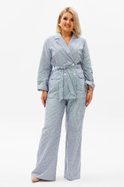 Брюки широкие, свободного прямого силуэта, на притачной поясе. Застёжка на тесьму-молнию в среднем шве переда и петлю и пуговицу по поясу. Передние части с талевой выточкой и косыми боковыми карманами. Задние части с талевой выточкой