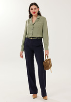 Брюки длинные, типа «клёш» прилегающего силуэта по бёдрам и от линии колена идут на расширение, со сгибом, на притачном поясе, застежка типа «гульфик» на тесьму-молнию, петлю и пуговицу по поясу. Задние части с талевыми выточками.