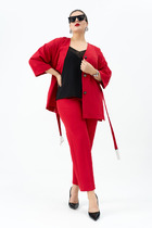 Юбка-брюки прямого силуэта, с притачным поясом на резинке: юбка по переду с мягкой складкой смещённой влево, по левому боковому с разрезом, декорированный отделочной тесьмой, правый боковой отлетной, брюки по боковым швам с разрезами (выполнены из трик. полотна).