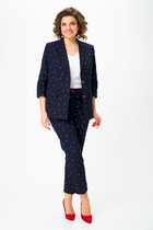 Костюм двухпредметный: состоящий из брюк и жакета. Жакет прямого силуэта. По переду нагрудная вытачка, переходящая в прорезной карман с клапаном. Двухбортная застёжка на петли-пуговицы. Рукав двухшовный, на логтевом шве отлетная шлица. Длина рукава 63 см. Длина изделия 77 см. Брюки полуприлегающего силуэта,зауженные к низу. По переду боковой карман, застежка на тесьму-молнию и пуговицу. Длина брюк 99 см