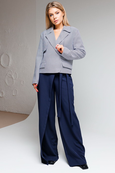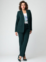 Жакет прямого силуэта, с воротником пиджачного типа. По переду и спинке отлетные кокетки. По переду в области талии декоративные клапаны. Жакет на  подкладке. Застежка на пришивные кнопки.