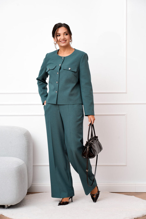 Костюм женский из костюмной ткани состоящий из жакета полуприлегающего силуэта на подкладки и брюк классического прямого кроя. Жакет с круглой горловиной и центральной застёжкой на петли и декоративные пуговицы. По полочке обработана нагрудная вытачка, в области груди настрочен клапан, закрепленный пуговицей. Спинка цельнокроеная. Рукав втачной двухшовный, длинный.