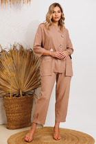 Элегантный вечерний костюм-двойка из шифона, состоящий из блузки свободного кроя и широких брюк. Красивый и эффектный брючный костюм - это идеальный образ для особых случаев, вечерних выходов, праздничных и торжественных мероприятий, будь то корпоратив, свадьба, юбилей, выпускной, день рождения, Новый год  Блузка прямого силуэта из шифона  со пущенной линией плеча. Рукав двойной, расширенный к низу со складками. По спинке и полочке идет планка. В комплекте с блузкой идет съемный пояс. На концах пояса металлизированная бахрома. Брюки прямые на трикотажной подкладке масло, с запахом по переду, пояс на резинке.Благодаря фасону и крою, костюм визуально вытянет силуэт, сделает фигуру стройнее, подчеркнет ее достоинства, скроет недостатки. Элегантный брючный костюм от Anastasia-   комфорт и уверенность в себе на любом мероприятии Длина блузки: (48-56)-61см. Длина рукава-52см. Длина брюк:(48-54)-105см., (56)-108см.