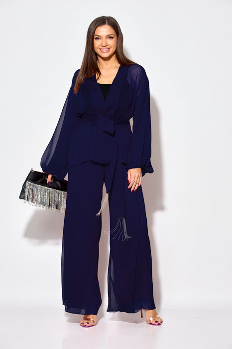 Элегантный вечерний костюм-двойка из шифона, состоящий из блузки свободного кроя и широких брюк на подкладке. Красивый и эффектный брючный костюм - это идеальный образ для особых случаев, вечерних выходов, праздничных и торжественных мероприятий, будь то корпоратив, свадьба, юбилей, выпускной, день рождения, Новый год. Блузка прямого силуэта из шифона со пущенной линией плеча. Рукав двойной, расширенный к низу со складками. По спинке и полочке идет планка. В комплекте с блузкой идет съемный пояс. На концах пояса металлизированная бахрома. Брюки прямые на трикотажной подкладке масло, с запахом по переду, пояс на резинке.Благодаря фасону и крою, костюм визуально вытянет силуэт, сделает фигуру стройнее, подчеркнет ее достоинства, скроет недостатки. Элегантный брючный костюм от Anastasia- комфорт и уверенность в себе! Длина блузки: (48-56)-61см. Длина рукава-52см. Длина брюк:(48-54)-105см., (56)-108см.