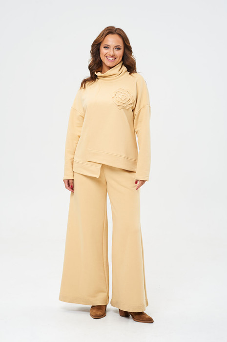 Шикарный трикотажный женский костюм от бренда Anastasia, идеальный для любого случая. Этот костюм сочетает в себе элегантность и комфорт, что делает его подходящим как для деловых встреч или домашней одежды, так и для праздничных мероприятий Идеальный на холодную погоду. Блуза прямого силуэта со спущенным плечом, низ по полочке фигурный, асимметричный и подрез в виде запаха. По низу снинки и полочки идет отрезной пояс. По полочке -декор в виде настроченного цветка из этой же ткани. Воротник - стойка хамут. Брюки, расширенные к низу, пояс на резинке, по бокам карманы. Отворот по низу на изнанку.Это не только универсальная одежда для деловых встреч или прогулок, но и идеальный выбор для различных торжественных мероприятий, подойдет как для взрослых женщин, так и для подростков. Отдельный части костюма легко будут сочетаться с вещами из Вашего гардероба. Модель можно отнести к стилю спортивный кэжуал, оверсайз, спортивный шик. Костюм можно носить с кроссовками или ботинками. Обязательно добавьте наш бренд в избранное и следите за новинками, распродажами, скидками и акциями! Хороших покупок от «Анастасия» Длина блузы (по спинке):(50-54)- 61см, (56-60)-62 см. Длина рукава: (50-60)-45см. Длина брюк: (50-54): 101см, (56-60)-104см