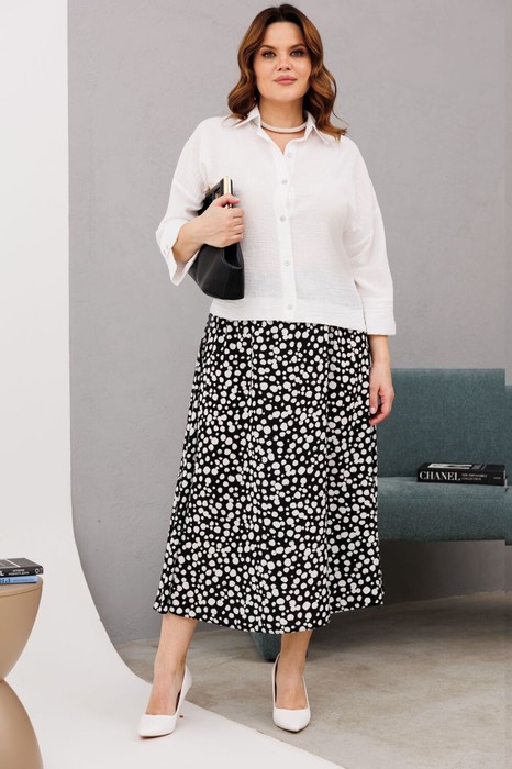 Комплект женский 2-х предметный (блузка, юбка). Отлично подойдет на любой тип фигуры, подчеркнет вашу женственность.  Блузка из текстильной  ткани прямого  силуэта со спущенным плечом. Застежка- планка на петли и пуговицы. Воротник на отрезной стойке. Рукав одношовный, втачной, 3/4 длины с манжетой. В качестве декора- по манжете пуговицы, по низу блузки широкая подгибка с отстрочкой.  Юбка расширенная к низу. Пояс на резинке. Длина блузки (50-54)- см, (56-60)- см . Длина рукава (50-60)-см. Длина юбки (50-60)-см.