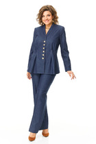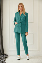 Костюм женский 2-х предметный (блузка, брюки) из экологически чистой ткани из волокон крапивы ( Рами) . Это прочный фактурный материал с серебристым отливом. Одежда из рами гипоаллергенна, хорошо впитывает влагу и устойчива к воздействию солнца.  Блузка прямого силуэта, застежка на планку и пуговицы. Воротник на отрезной стойке, по полочке накладные карманы . Низ фигурный, закругленный, спинка длиннее полочки. По спинке идет двойная кокетка со складками. Плечо спущенное, рукав длинный, на манжете. Длину рукава можно регулировать  патой.  Брюки- палаццо прямые на подкладке в виде шорт. Пояс на резинке. По низу широкая подгибка.  В качестве декора - металлическая брендированная нашивка на кармане. Длина по спинке (50-54) - 75см, (56-60) - 77 см. Длина рукава (с манжетой): (50-54) - 58 см, (56-60) -59см. Длина брюк: (50-54) - 102 см, (56-60) - 105 см