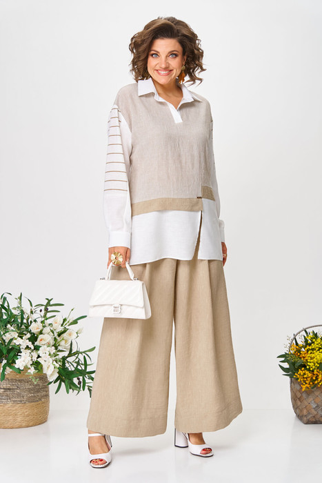 Комплект создан для тех, кто ценит комфорт и элегантность в каждой детали. В комплект входит блузка и штаны палаццо. Оверсайз крой придаёт костюму особый шарм, а легкая невесомая ткань дает свободу движений. Высокая посадка и резинка по поясу подчёркивает талию и делает силуэт более изящным. Смесь натуральных материалов позволяет пропускать воздух и отводить влагу, что особенно важно в жаркую погоду и прохладное утро. Ткань не мнется. Благодаря свободному крою костюм подойдёт для разных типов фигуры. Он подчеркнёт вашу индивидуальность и станет отличным дополнением к вашему летнему гардеробу. Этот брючный костюм — не просто одежда, это заявление о вашем стиле и вкусе. В нём вы будете чувствовать себя уверенно и комфортно, зная, что выглядите на все сто. Выбирая этот костюм, вы выбираете качество, комфорт и стиль. Выберите льняной костюм и наслаждайтесь летом в полной мере!Блузка прямого силуэта, застежка на планку и пуговицы. Воротник на отрезной стойке. По полочке идет ассиметричный подрез со вставками из 2-х видов однотона и разрезом. Плечо спущенное, рукав длинный со вставками из ткани в полоску, на манжете. По спинке идет кокетка из ткани в полоску и встречная складка. Брюки полаццо прямые с односторонней складкой и запахом по центру. По низу брюк широкая подгибка.Пояс на резинке . В качестве декора- брендированная металлическая нашивка по подрезу полочки. Длина по спинке (50-54) - 74 см, (56-60) - 76 см. Длина рукава (с манжетой): (50-54) - 57 см, (56-60)-59см. Длина брюк: (50-54) - 98 см, (56-60) - 99 см