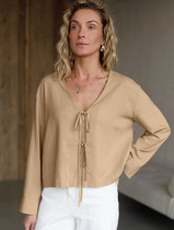 Укороченная свободная блузка с завязками и с V-вырезом изо льна с вискозой