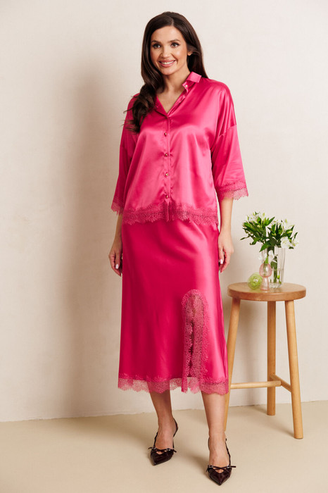 Женский элегантный  костюм от Anastasia, подходящий для нарядной и повседневной носки. Костюм женский 2-х предметный из атласной ткани с отделкой из деликатного кружева (блузка, юбка).  Ажурное кружево, деликатно украшающее низ костюма, добавляет образу романтичности и утонченности. Отлично подойдет на любой тип фигуры, подчеркнет вашу женственность.  Блузка  прямого  силуэта со спущенным плечом. Застежка- планка на петли и пуговицы. Воротник на отрезной стойке. Рукав одношовный, втачной, 3/4 длины.   Юбка косая с разрезом по колену   длины миди выполнена из мягкого атласа, который приятно струится по фигуре, создавая женственный и изысканный силуэт. Пояс на резинке. Юбка с кружевом внизу  станет идеальным выбором для создания как повседневных, так и праздничных образов.   Длина блузки с крудевом (50-54)- 59см, (56-60)- 62см . Длина рукава с кружевом (50-60)- 29см. Длина юбки с кружевом (50-60)- 90 см.