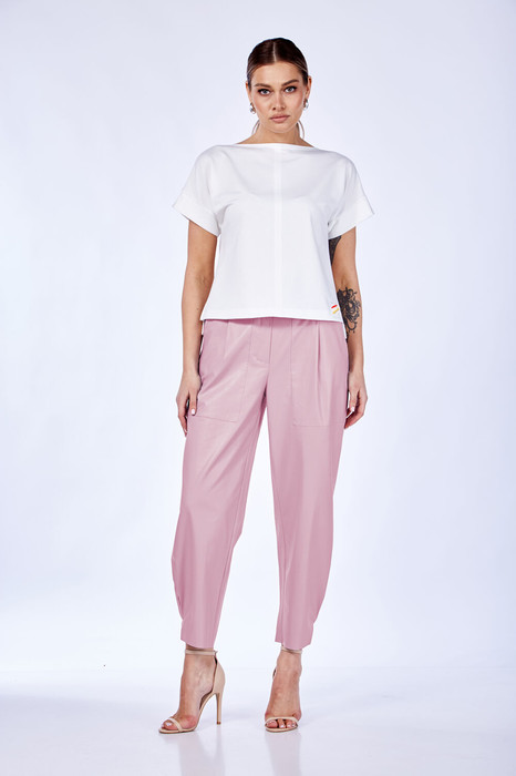 Комплект женский 2-х предметный (топ и брюки). Топ прямого силуэта из трикотажного полотна со спущенным плечом, по бокам разрезы, спинка длиннее чем полочка. По центру полочки и спинки - отделачная строчка. Рукав в виде манжены, вырез горловины в форме лодочки. В качестве отделки по низу полочки - нашивка. Брюки бананы из Эко-кожи. Укороченные, сужающиеся к низу за счет встречной складки. По переду идут подрезные карманы и складка по линии талии. Застежка на молнию. Пояс отрезной с резинкой.Благодаря своему крою и фасону костюм подчеркивает женственные формы и скрывает то, что должно быть незаметным. Это повседневный вариант на каждый день для занятий в школе или для офиса, на работу или на прогулку, а также на празничные выходы. Достаточно добавить соответствующие аксессуара и обувь. Топ и брюки можно легко совмещать с другими предметами вашего гардроба. Длина спинки(46-50)-55 см, (52-54)-58см. Длина рукава (манжета): (46-54)-4 см. Длина брюк: (46-50)-94см, (52-54)-96см.