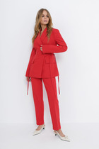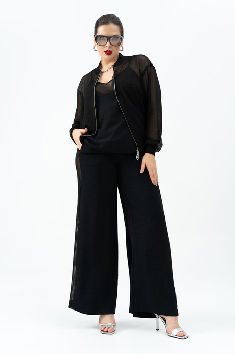 Костюм женский  тройка на  любые  мероприятия,  состоящий из  бомбера ,брюк и топа. модный соременный  бомбер из сетки, с центральной бортовой застёжкой на  тесьму-молнию. По горловине, по  низу, и по низу рукавов обработан довяз, на полочках фигурные накладные карманы. Рукава втачные одношовные по низу с притачной манжетой.. Спинка цельная. Брюки женские    прямого кроя, на притачном поясе по переду и с резинкой по спинке. Передние половинки  с   карманами в швах.  Брюки  по боковым швам со вставкой из сетки.   Топ прямого силуэта с нагрудными вытачками и с разрезами по боковым швам. Блузка-топ с регулирующей  с еегулирующей фурнитурой. По вырезу горловины вставка из сетчатого материала.