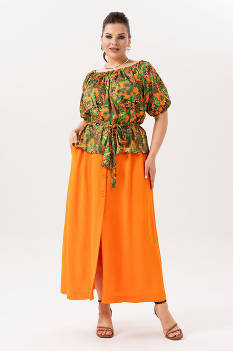 Комплект женский состоящий из блузки-туники и юбки. Блузка   с удобными реглан рукавами 3/4 с эластичной резинкой на низу, что добавляет изделию изысканности. Горловина на эластичной резинке позволяет носить блузку с открытыми плечами, подчеркивая женственность образа. Съемный пояс подчеркивает талию, придавая фигуре еще большую выразительность.  Юбка на поясе по полочке с двумя шлёвками, по спинке на резинке. юбка по переду на пуговицах, с боковыми наклонными карманами.