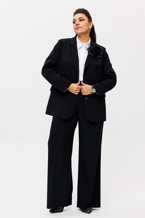 Брюки палаццо на резинке с карманами создают эффектный силуэт и придают образу легкость и грацию. Однобортный оверсайз жакет добавляет современную нотку и непринужденность, делая костюм идеальным выбором для любых случаев — от деловых встреч до вечерних прогулок.
