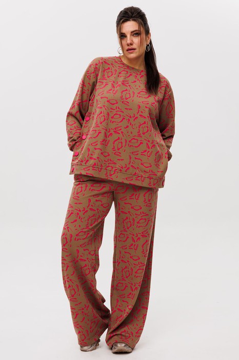 Трикотажный костюм от Анелли  с анималистичным, ярким принтом – это идеальное сочетание стиля и комфорта для повседневного гардероба. Он включает в себя просторные брюки палаццо на круговой резинке, что обеспечивает удобную посадку и легкость в движении. Благодаря свободному крою и функциональным карманам, брюки смотрятся элегантно и практичны в носке.