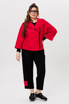 Свободный крой со спущенным плечом и рубашечным рукавом на манжете создаёт непринуждённый силуэт, асимметричный низ свитшота с необработанным краем придаёт дерзкую небрежность. Брюки с поясом на резинке и удобными карманами — спереди с отрезным бочком, сзади накладными — доводят идею комфорта и вау эффекта до совершенства.