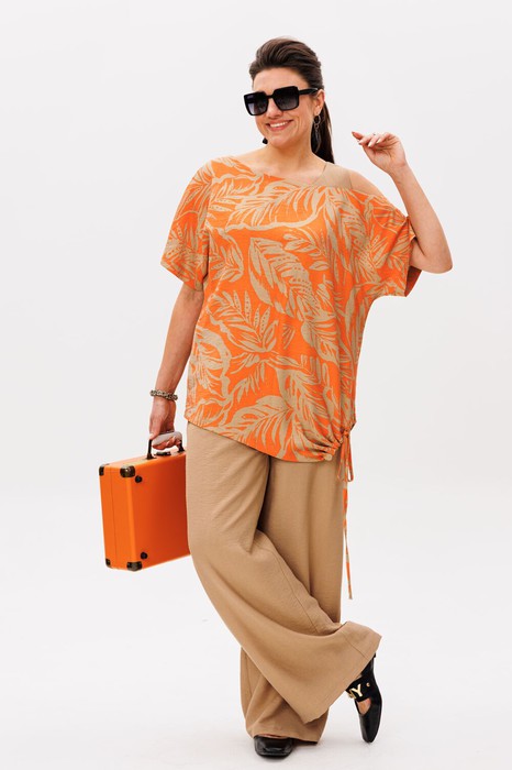 Принт «апельсиновый капучино» словно всплеск красок на холсте, превращает костюм в произведение искусства. Каждая деталь продумана так, чтобы блузу и брюки можно было легко комбинировать с другими вещами — ансамбль звучит гармонично как в дуэте, так и соло.