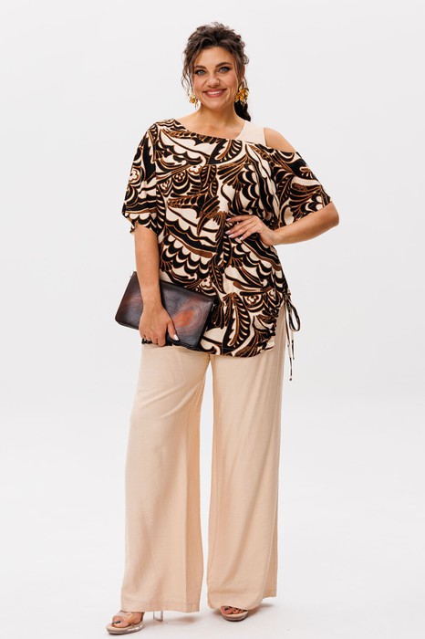 Принт «латте с фундуком» словно всплеск красок на холсте, превращает костюм в произведение искусства. Каждая деталь продумана так, чтобы блузу и брюки можно было легко комбинировать с другими вещами — ансамбль звучит гармонично как в дуэте, так и соло.