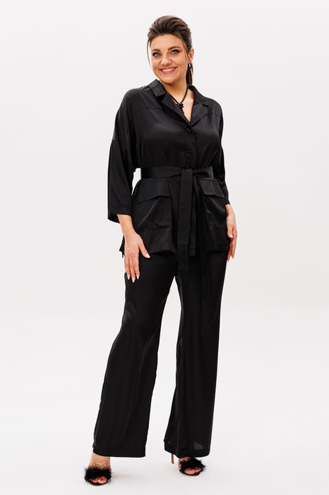 Блуза с изящной линией плеча и расширенным укороченным рукавом создаёт элегантную небрежность. Классический воротник с лацканами и накладные карманы добавляют стильную строгость, а застёжка на пуговицу и декоративный съёмный пояс позволяют играть с силуэтом.