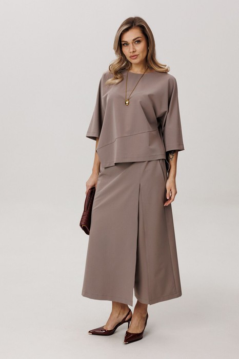 Низ костюма это юбка-брюки-кюлоты на высокой талии, струящиеся и расклешённые. Модель на запах с мягкими складками создаёт ощущение простора и лёгкости, а скрытые, фигурные карманы в швах берегут чистоту линий.