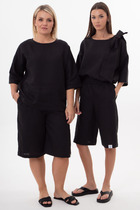 Стильный брючный комплект, состоящий из свободной блузки и брюк-палаццо. Элегантный бант на блузке подчеркнет Вашу женственность и романтичность. Эффектный комплект идеально подойдет для рабочих будней, а также для дружеских встреч и романтических прогулок.