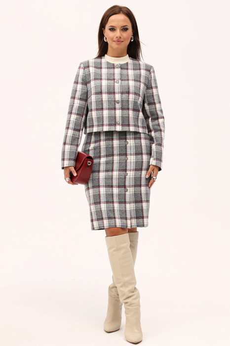 Модный юбочный комплект из костюмной ткани в клетку, состоящий из укороченного прямого жакета и юбки-карандаш, сочетает в себе сдержанность и элегантность. Это один из классических вариантов одежды востребованный для любого случая, отлично подойдет для офиса и работы в прохладное время года.