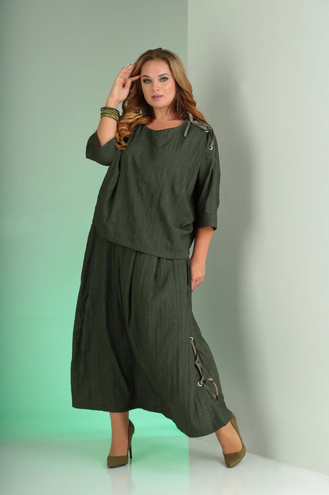 Юбка: свободного силуэта в стиле "бохо" из трикотажной ткани. По переднему и заднему полотнищу юбки по 4 складки. В боковых швах функциональные карманы, по талии изделия пояс с эластичной тесьмой (резинкой).