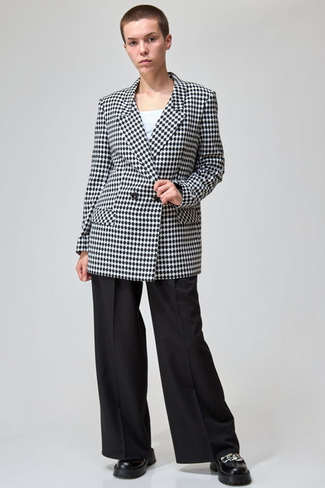 Жакет прямого силуэта, длиной ниже линии бедра, на подкладке, с плечевыми накладками, с двубортной застежкой на петли и пуговицы. Воротник пиджачного типа с отложными лацканами. Перед с талиевыми вытачкам и подрезными бочками, переходящими на спинку, с прорезными карманами в рамку с клапаном. Спинка с средним швом. Рукав втачной двухшовный длинный.