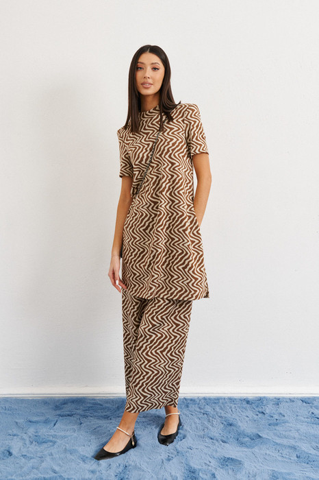 Комфортный комплект состоит из удлиненного джемпера и кюлот выполнен из трикотажного полотна с абстрактным принтом. Характеристики джемпер прямой крой, подплечники, горловина стойка, рукав втачной, в боковых швах изделия разрезы 40 см. Длина изделия 86 см, длина рукава 22 см. Кюлоты прямого свободного кроя, пояс - резинка, в боковых швах карманы. Длина кюлот 91 см.