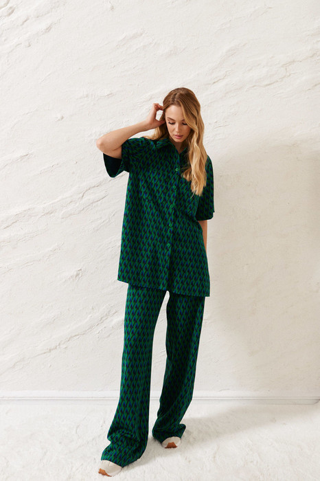 Комплект состоящий из рубашки и брюк выполнен из трикотажного полотна с абстрактным геометрическим принтом. Характеристики: рубашка прямого свободного кроя, воротник классический - отложной, застежка центральная на петли пуговички, по переду крупные карманы, рукав втачной короткий, в боковых швах разрезы спинка цельнокроеная. Длина рубашки по спинке 75 , длина рукава 27 см. Брюки прямого свободного кроя, пояс на резинке, в боковых швах карманы. Длина брюк 117 см.