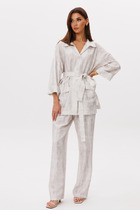 Комфортный комплект состоящий из рубашки и брюк выполнен из трикотажного полотна. Характеристики: рубашка прямого свободного кроя, воротник классический - отложной, застежка центральная на петли пуговички, по переду крупные карманы, рукав втачной короткий, в боковых швах разрезы спинка цельнокроеная. Длина рубашки по спинке 75 , длина рукава 27 см. Брюки - прилегающий силуэт, брюки без пояса - на подгибе, подгиб в области талии на резинке. Длина 114 см.