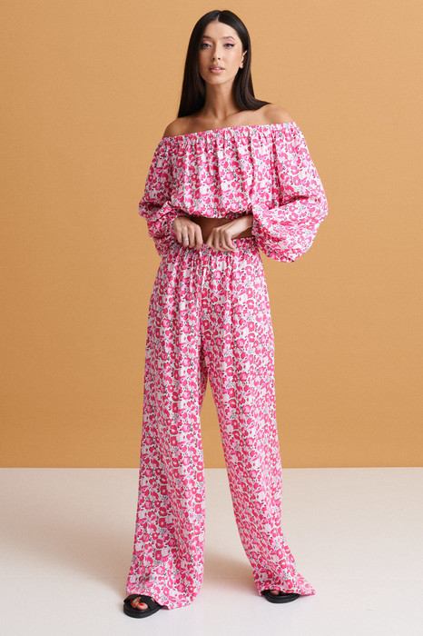 Комплект состоит из топа и брюк выполнен из струящегося полотна с цветочным принтом. Характеристики: топ прямого кроя, горловина и верх рукава на резинке, плечи полуоткрыты, низ рукава на резинке, низ изделия заканчивается я резинкой. Длина по пинке 32 см, длина рукава 60 см. Брюки прямого свободного кроя пояс брюк на резинке, в боковых швах кармашки. Длина брюк 113 см.