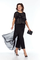 Комплект состоит из рубашки и брюк выполнен из ткани с цветочным принтом. Характеристики: рубашка прямого кроя, отложной воротник на стойке , застежка центральная на петли пуговицы, по переду крупные накладные карманы, рукав свободного кроя спущен, по низу рукава рюша выполнена из ткани основного изделия, в боковых швах разрезы. Брюки прямого кроя, пояс на резинке, в боковых швах карманы, по низу брюк рюша выполнена из ткани основного изделия.