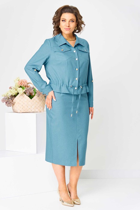 Костюм женский двойка, свободного силуэта, состоящий из жакета и юбки. Жакет с центральной застежкой по переду. Воротник мужской, рукав длинный с манжетом, на пату. По переду и спинке кокетки. Карманы по полочке в области груди. Из-под кокетки рельефы. По низу жакета кулиска.