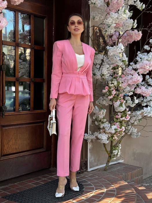 Костюм 2-хпредметный.       Жакет  приталенного силуэта, обработан подкладкой. Отрезной по линии талии, декорирован пришитым поясом по линии талии. Низ изделия обработан баской, собранной в складку. Рукав длинный, вачной. Окат рукава обработан вставкой для удлиннения плечевого шва.  Перед жакета обработан сборкой.   Брюки прямого кроя, длинна 7/8, застёжка- гульфик , по боковым швам обработаны карманы