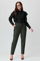 Этот 3-х предметный комплект состоит из жакета, корсетного топа и брюк. Жакет - настоящая жечужина в гардеробе. Небанальный вариант застёжки сбоку на лицевой стороне, и потайной пуговицей внутри изделия придаёт жакету характер, подчёркивает силуэт и линию талии. Жакет выгодно акцентирует фигуру, создавая утончённый и женственный образ. Благодаря декоративным рюшам из вуали, он легко станет центральным элементом образа. Карманы с клапанами. Корсетный топ с открытыми плечами — воплощение чувственной элегантности. Открытые плечи подчеркивают линию шеи и ключиц, а корсетный крой создает безупречный силуэт. Роскошный силуэт и акцентная баска делают его идеальным выбором для особенного вечера. Также топ отлично вписывается в повседневные образы. Брюки станут глотком свежего воздуха среди широких силуэтов и брюк палаццо. Их облегающий крой подчёркивает линию бедёр и тали, а затем изящно расклешается от колена.Такой фасон позволит скорректировать фигуру и подойдёт для строго дресс кода. Вертикальные линии по центру брючин вытягивают силуэт и удлиняют ноги. Застёжка классическая - молния и пуговица в цвет изделия.