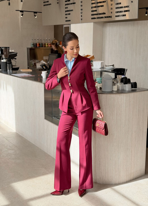 Этот 2-х предметный комплект состоит из жакета и брюк.                                                                                    Жакет. Нежный утонченный жакет выполнен из плотной костюмной ткани, обработан подкладкой. Приталенный крой мягко облегает фигуру, а изящные подплечники добавляют образу уверенности и грации, напоминая о классических образах французского кинематографа. Складки, создающие рельеф баски, мягко ложатся на бедра за счет своей геометрии. Рукава прямые втачные, одношовные.                             Брюки.  Брюки станут глотком свежего воздуха среди широких силуэтов и брюк палаццо. Их облегающий крой подчёркивает линию бедёр и тали, а затем изящно расклешается от колена.Такой фасон позволит скорректировать фигуру и подойдёт для строго дресс кода. Вертикальные линии по центру брючин вытягивают силуэт и удлиняют ноги. Застёжка классическая - молния и пуговица в цвет изделия.