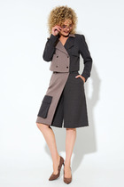 Этот 2-х предметный комплект состоит из жакета и юбки.                                                                                      Жакет. Нежный утонченный жакет выполнен из плотной костюмной ткани, обработан подкладкой. Приталенный крой мягко облегает фигуру, а изящные подплечники добавляют образу уверенности и грации, напоминая о классических образах французского кинематографа. Складки, создающие рельеф баски, мягко ложатся на бедра за счет своей геометрии. Рукава прямые втачные, одношовные.  Юбка. Офисный стиль может быть безумно притягательным. Длина мини, кокетливый разрез по среднему шву задней половинки юбки, прилегающий силуэт подчеркнет достоинства фигуры
