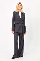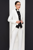 Комплект женский, состоящий из жакета и брюк. Жакет прямого силуэта, укороченный с воротником "шаль" двубортный. Изделие на подкладке. Брюки прямые, облегающие по бедрам и расширенные к низу, со стрелками.