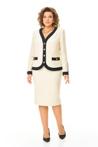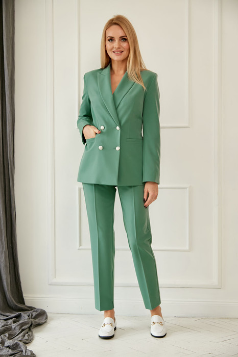 Костюм женский классический, состоит из жакета и брюк. Жакет полуприлегающего силуэта с втачным рукавом, по низу рукава шлица с пуговицами. Спереди два прорезных кармана. По спинке шлица, изделие на подкладке с дизайном (дизайн может меняться). Брюки-зауженные книзу 7/8 длины, с боковыми карманами, на поясе, спереди застегивается на молнию и пуговицы.