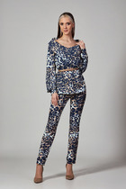 Комплект женский брючный спортивный,состоящий из джемпера и брюк. Джемпер свободгого покроя со спущенной проймой и рукавом на манжете, с застёжкой спереди на молнию, с воротником, с карманами по переду изделия. На манжете по низу изделия. Брюки прямые, расширенные к низу, на поясе с эластичной тесьмой, с карманами в боковых швах.