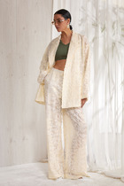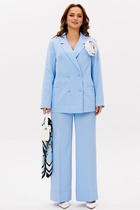 Брюки прямые на цельнокроеном поясе с резинкой по кругу и застроченными кантами спереди.