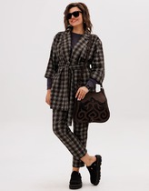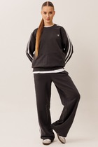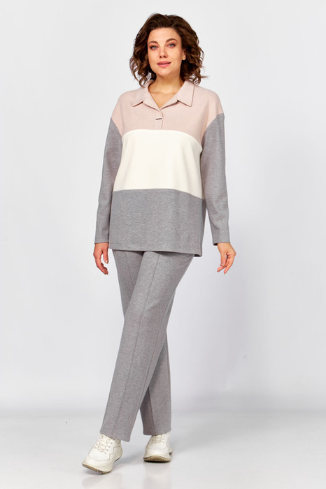 Женский двухпредметный костюм состоит из удлиненного джемпера и брюк, выполнен из трикотажного полотна в мелкий рубчик 3 цветов.