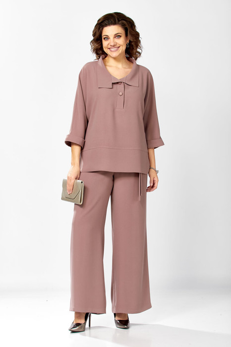 Женский двухпредметный костюм состоит из свободной блузы и широких брюк,выполнен из однотонной плательно-костюмной ткани.