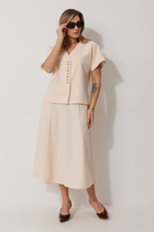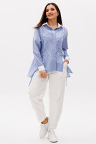 Туника прямого силуэта с цельнокроеной стойкой и ассисетричным низом.По центру переда и передних полотнищах брюк выполнены канты.Плечи слегка спущены.Рукава одношовные длинные.По низу декоративная металлическая пластинка.