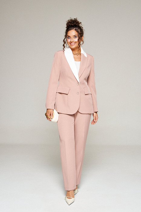 Воротник отрезной фигурный типа «шаль», правая часть которого выполнена из ткани-компаньона смежного оттенка. Низ борта округлой формы. Застежка центральная однобортная низкая на две петли и пуговицы.